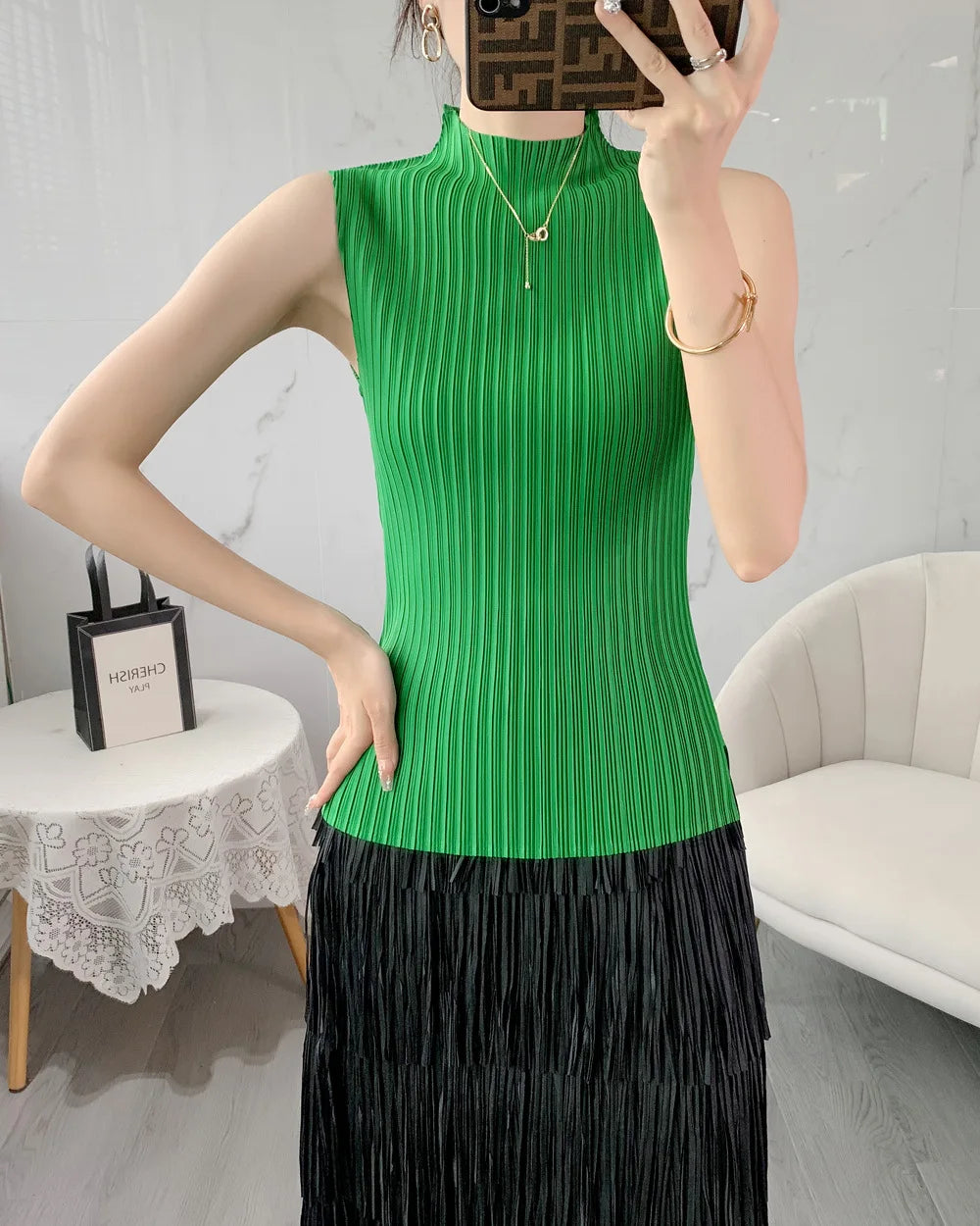 Miyake Pleated Elegant Fashion Temperament Solid Color Half High Neck Sleeveless Women's Vest 2023 Summer New Breathable Top